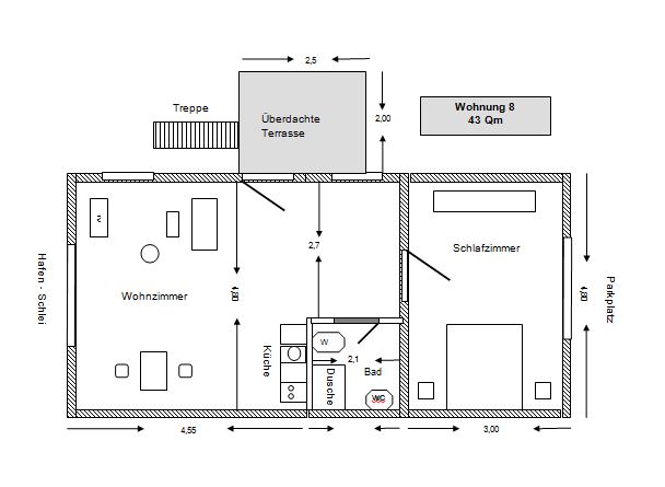 43 qm Ferienwohnung im 1.Stock mit Schleiblick und überdachten Balkon für 2 Personen.
